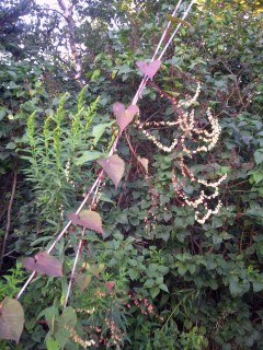 My husband and I were pulling out some suckers away from a blueberry bush in our back yard and I noticed this! Heart shaped leaves climbing an unused clothesline that has been drooping unused from the pole.