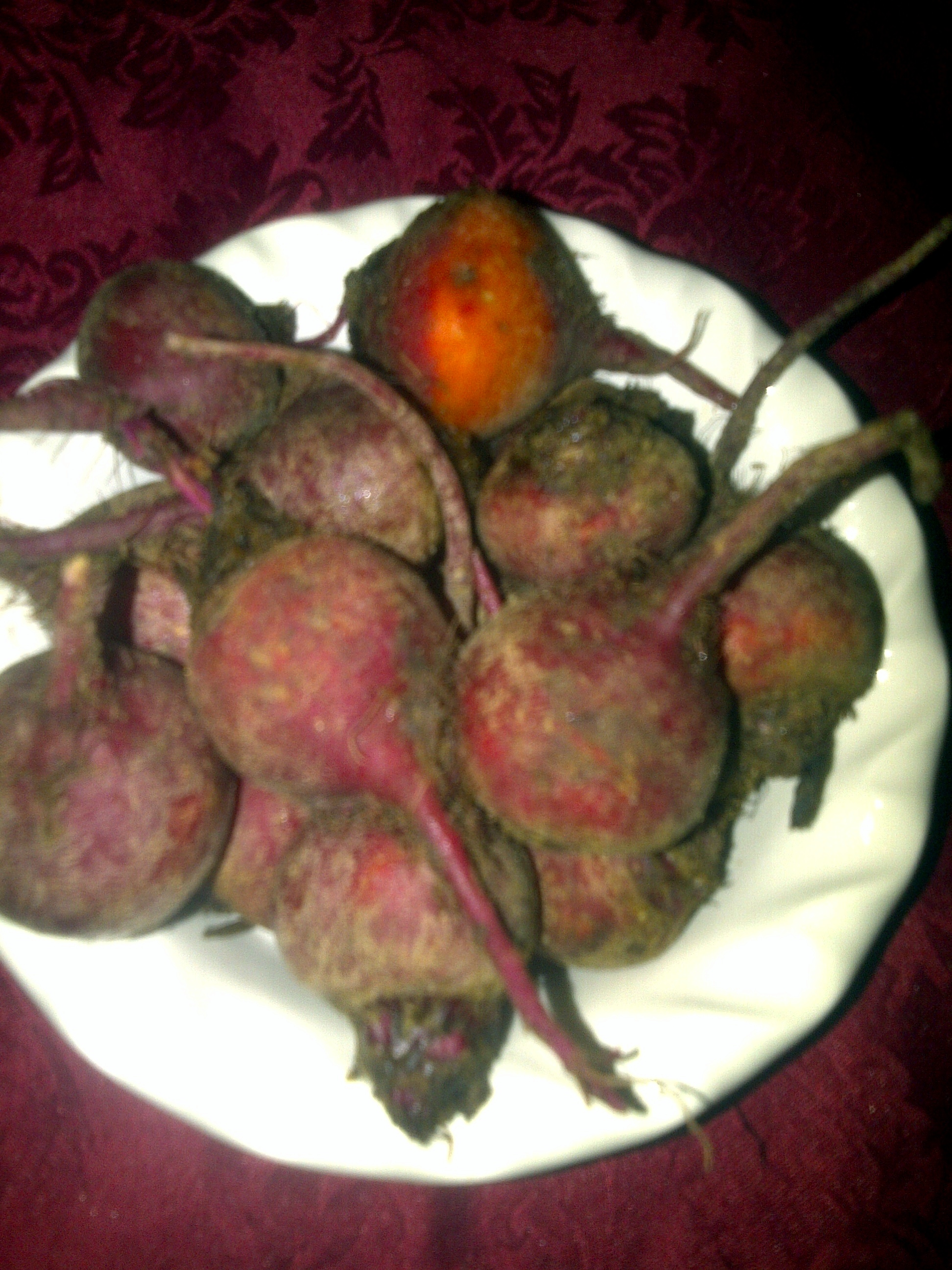 We get a box of fruit and vegetables each week from Taproot Farms. This week we got beets! One of my favourite veggies. As you can see from the picture, they still had a considerable amount of dirt on them. Unlike vegetables from the grocery store, ours come with minimal primping.