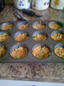 Divide the mixture equally between the 12 muffin sections, compress with the back of a spoon so that they stay together when they are cooked.
