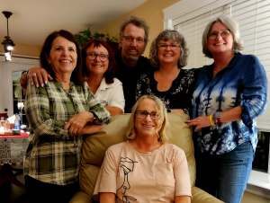 Photo – L-R: Rosemary, Shelley, Kevin, me, Patricia, seated: Sharon .