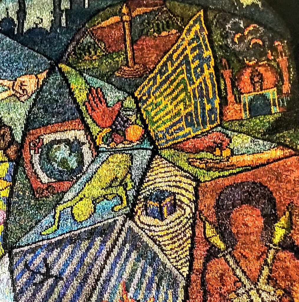It was an astounding show! Three HUGE knitted panels that looked like stained-glass windows; I think they must have been about 5 x 8 feet each! After the show, we were encouraged to go up and talk with Kirk and get close to the panels and touch them! Each panel told some of the story of that particular tradition. So, for those of you who need a refresher, Abraham is considered to be the spiritual ancestor of Judaism, Christianity and Islam. Abraham made the first covenant with God…